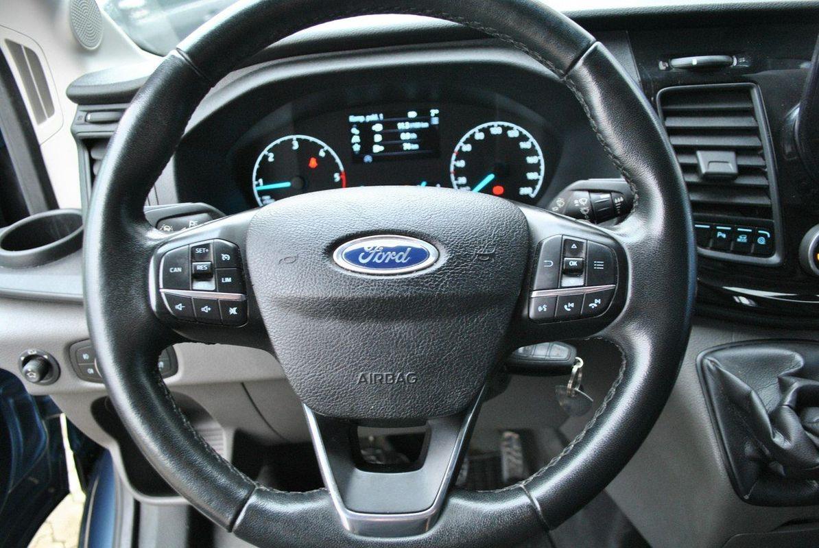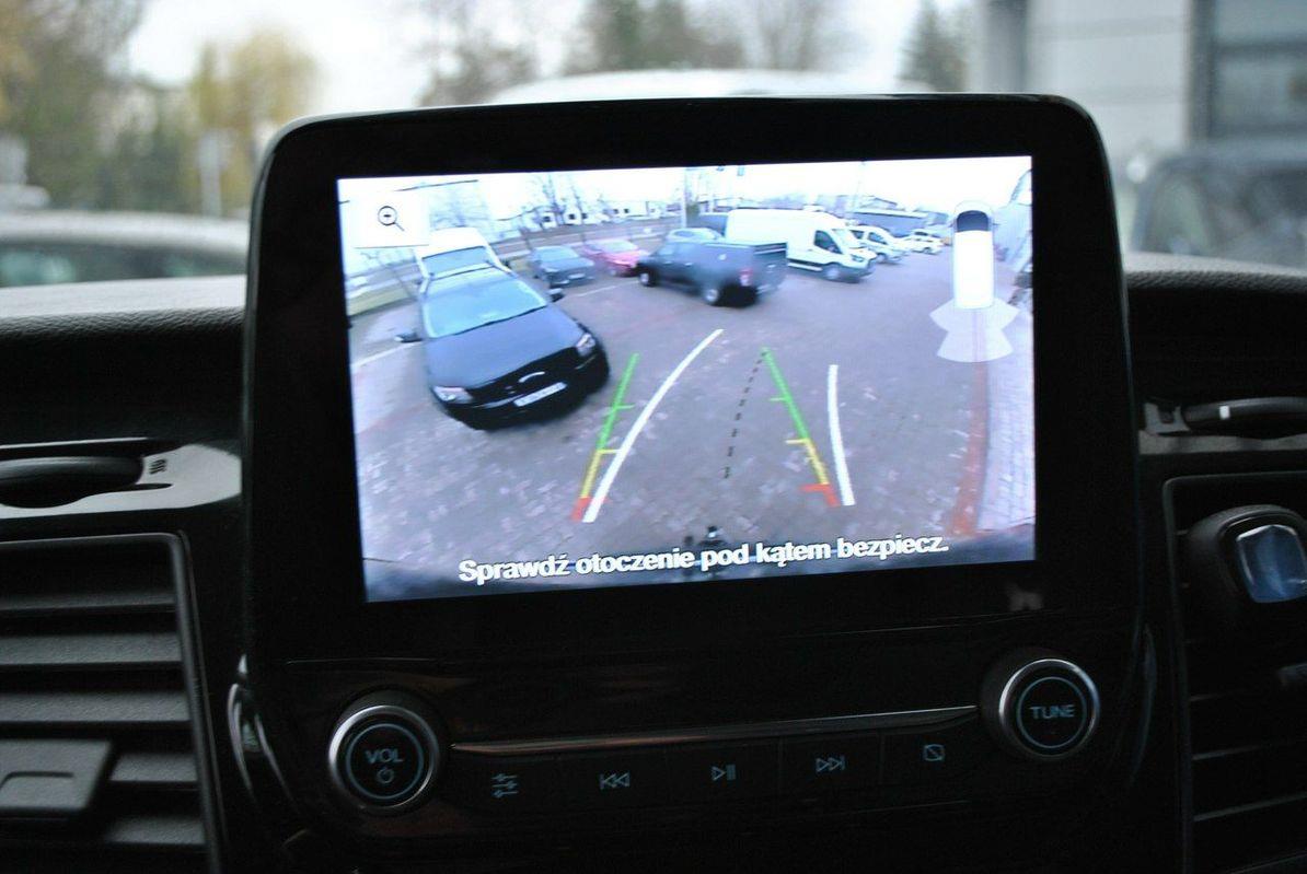Wspomaganie nagłego hamowania (EBA), Roll Stability Control (RSC) - system zapobiegający wywróceniu pojazdu, układ ułatwiający ruszanie pod górę (HSA), elektroniczny układ stabilizacji toru jazdy (ESC), system zapobiegający blokowaniu kół (ABS) z elektronicznym systemem rozdziału sił hamowania (EBD) Przednie światła przeciwmgielne z adaptacyjnym doświetlaniem zakrętów Centralny zamek sterowany pilotem z dwoma kluczykami Czujniki parkowania z przodu i z tyłu Poduszka powietrzna kierowcy, poduszka powietrzna pasażera z przodu Kierownica pokryta skórą Elektrycznie sterowane szyby przednich drzwi Tempomat z regulowanym ogranicznikiem prędkości Lane Keeping Alert System ostrzegania przed niezamierzonym zjechaniem z pasa ruchu rozpoznaje, że pojazd zbliża się do oznaczeń pasa ruchu i ostrzega kierowcę drganiami kierownicy System zawiera dodatkowo: system monitorowania koncentracji kierowcy 4.2” monochromatyczny wyświetlacz w zestawie wskaźników Automatyczna zmiana świateł drogowych na mijania Boczne drzwi przesuwne po stronie pasażera Klimatyzacja manualna Zestaw głośnomówiący Bluetooth® Modem FordPass Connect Fotel kierowcy z regulacją w 4 kierunkach Kierownica pokryta skórą Kolumna kierownicy regulowana w dwóch płaszczyznach Komputer pokładowy Elektrycznie sterowane szyby przednich drzwi TRAIL