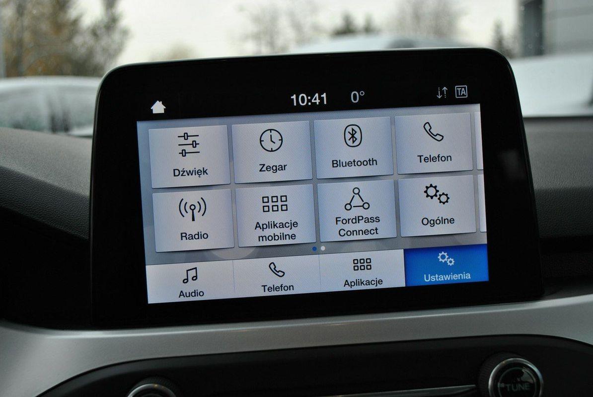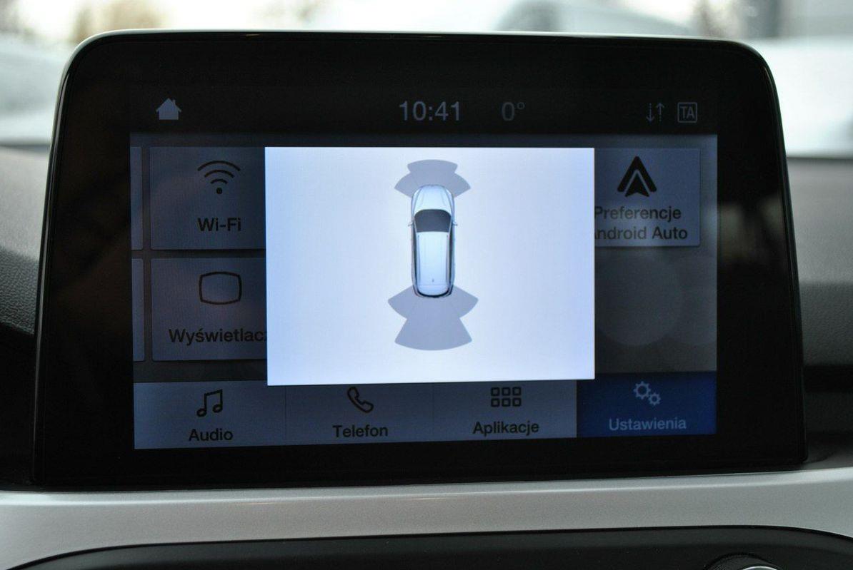 Układ kierowniczy ze wspomaganiem elektrycznym Elektrycznie regulowane i podgrzewane lusterka boczne Światła do jazdy dziennej w technologii LED Reflektory automatyczne z tłem w kolorze aluminium System Ford EasyFuel System Pre-Collision Assist z systemem aktywnego hamowania System kontroli pasa ruchu Lane Keeping Alert Inteligentny ogranicznik prędkości 3-ramienna kierownica i uchwyt dźwigni zmiany biegów wykończone skórą Zamek centralny ze zdalnym sterowaniem Elektrycznie sterowane szyby przednich i tylnych drzwi Konsola dachowa - średniej długości, z lampkami LED w 1. i 2. rzędzie siedzeń System Ford MyKey System monitorowania ciśnienia w oponach 16" obręcze kół ze stopów lekkich, wzór 5x2-ramienny Listwa wzdłuż dolnej linii szyb bocznych w kolorze chromu Relingi dachowe w kolorze srebrnym Przednie światła przeciwmgielne ze światłami doświetlającymi zakręty Radioodtwarzacz z SYNC3 zawiera m.in.: 6.5" kolorowy ekran dotykowy, Bluetooth, sterowanie głosem w języku polskim, funkcję wzywania pomocy, 2x USB, 6 głośników Konsola centralna z podłokietnikiem Przednie fotele w stylu sportowym Elektryczny hamulec postojowy z funkcją Auto Hold Tempomat Pakiet Comfort Klimatyzacja dwustrefowa z automatyczną regulacją temperatury (DEATC) Wycieraczki przedniej szyby sterowane automatycznie, z czujnikiem deszczu reflektory automatyczne Lusterko wsteczne ściemniające się automatycznie Pakiet Winter Przednia szyba podgrzewana (Quickclear) Podgrzewane dysze spryskiwaczy Podgrzewane przednie fotele Podgrzewana kierownica Czujniki parkowania – przód i tył Lakier metalizowany