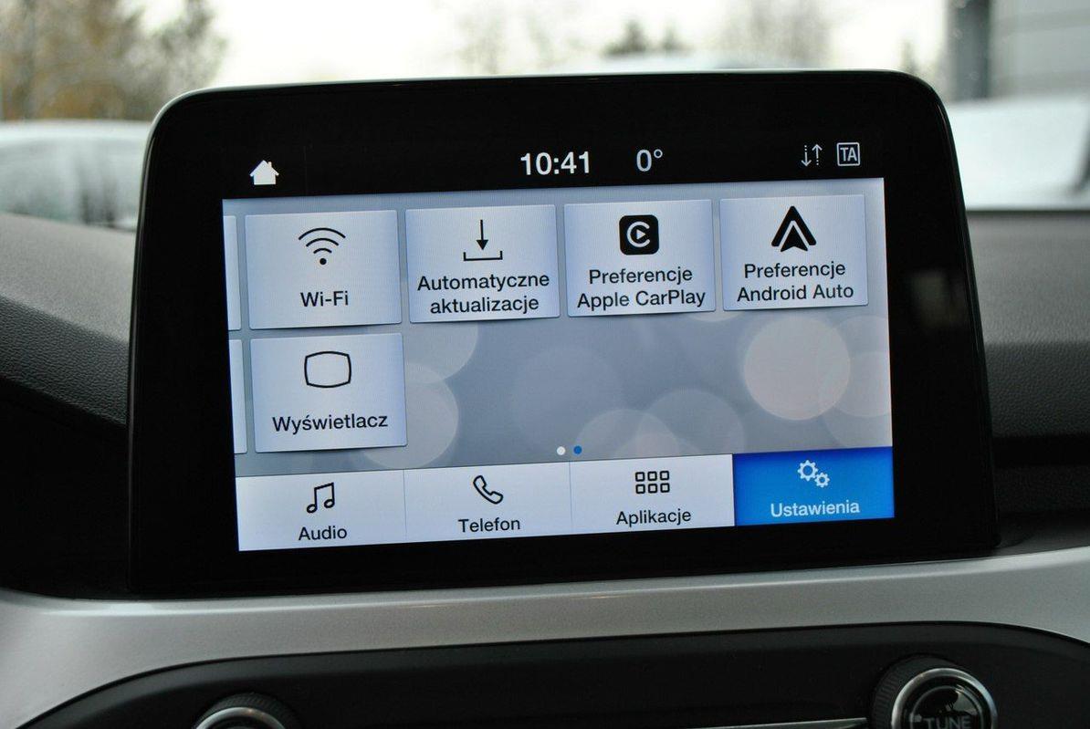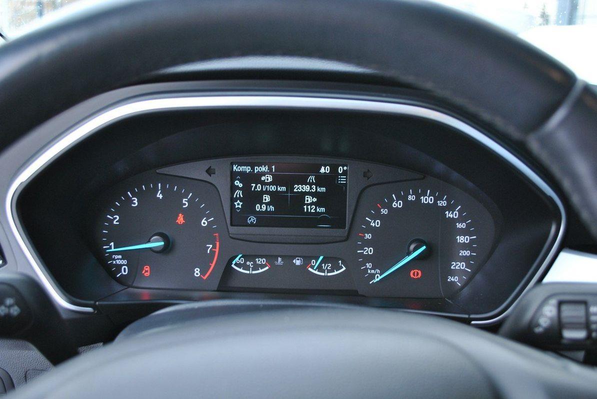 Układ kierowniczy ze wspomaganiem elektrycznym Elektrycznie regulowane i podgrzewane lusterka boczne Światła do jazdy dziennej w technologii LED Reflektory automatyczne z tłem w kolorze aluminium System Ford EasyFuel System Pre-Collision Assist z systemem aktywnego hamowania System kontroli pasa ruchu Lane Keeping Alert Inteligentny ogranicznik prędkości 3-ramienna kierownica i uchwyt dźwigni zmiany biegów wykończone skórą Zamek centralny ze zdalnym sterowaniem Elektrycznie sterowane szyby przednich i tylnych drzwi Konsola dachowa - średniej długości, z lampkami LED w 1. i 2. rzędzie siedzeń System Ford MyKey System monitorowania ciśnienia w oponach 16" obręcze kół ze stopów lekkich, wzór 5x2-ramienny Listwa wzdłuż dolnej linii szyb bocznych w kolorze chromu Relingi dachowe w kolorze srebrnym Przednie światła przeciwmgielne ze światłami doświetlającymi zakręty Radioodtwarzacz z SYNC3 zawiera m.in.: 6.5" kolorowy ekran dotykowy, Bluetooth, sterowanie głosem w języku polskim, funkcję wzywania pomocy, 2x USB, 6 głośników Konsola centralna z podłokietnikiem Przednie fotele w stylu sportowym Elektryczny hamulec postojowy z funkcją Auto Hold Tempomat Pakiet Comfort Klimatyzacja dwustrefowa z automatyczną regulacją temperatury (DEATC) Wycieraczki przedniej szyby sterowane automatycznie, z czujnikiem deszczu reflektory automatyczne Lusterko wsteczne ściemniające się automatycznie Pakiet Winter Przednia szyba podgrzewana (Quickclear) Podgrzewane dysze spryskiwaczy Podgrzewane przednie fotele Podgrzewana kierownica Czujniki parkowania – przód i tył Lakier metalizowany
